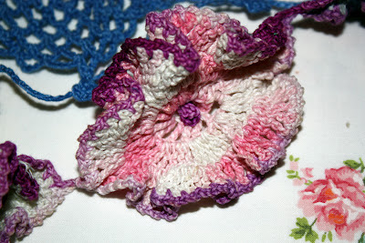 ReplyDeleteYour second from bottom pic (with the ten pink flowers' is very similar to one I made and in almost the same colours, lol. I love the Irish crochet leaf in it.